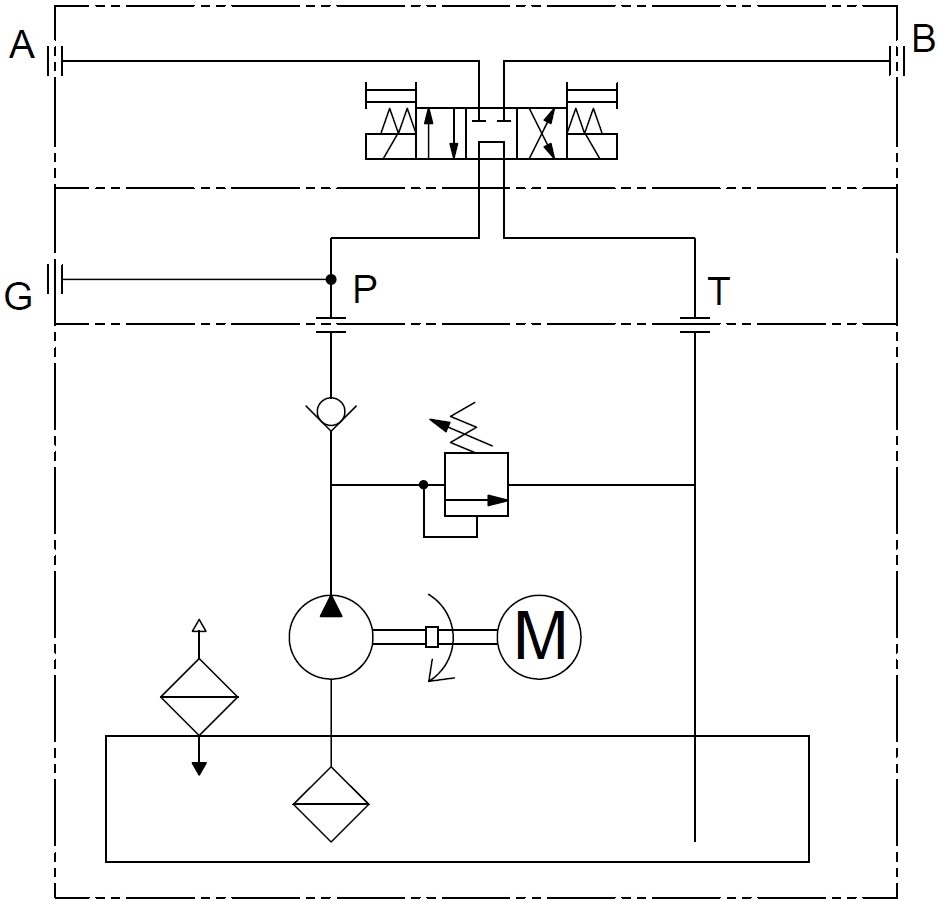 A compact hydraulic power pack allows installation in confined spaces and are intended for use in lifting platforms, small presses, machine tools and vehicles. A compact power pack in hydraulics consists of an electric motor, a pump, a housing and a tank. The aluminium housing forms the supporting part of the compact power pack, to which all main parts including hydraulic components are attached. The function of the compact power pack can be seen from the relevant circuits. By fitting NG04 or NG06 hydraulic valves, the compact units can be the compact units can be converted into complete drive and control units. The standard connection plates for directional control valves have the consumer connections A and B arranged on one side. The compact hydraulic unit can be installed horizontally or vertically. When using rectangular tanks, the installation position is always horizontal.